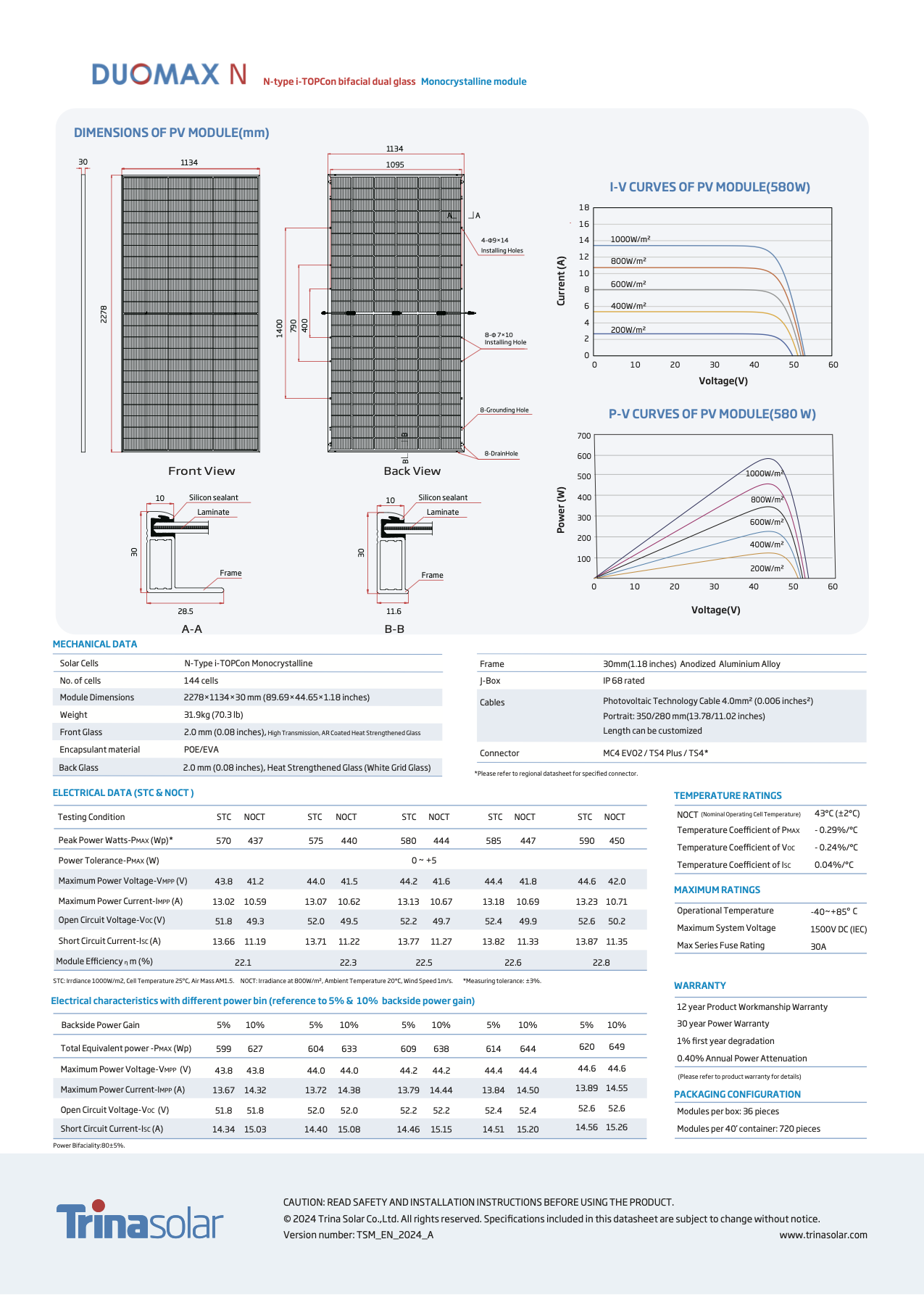 Este panel solar bifacial de doble cristal TRINA Solar DUOMAX N 590 W Panel Solar de un fabricante de primera línea ofrece un excelente rendimiento: